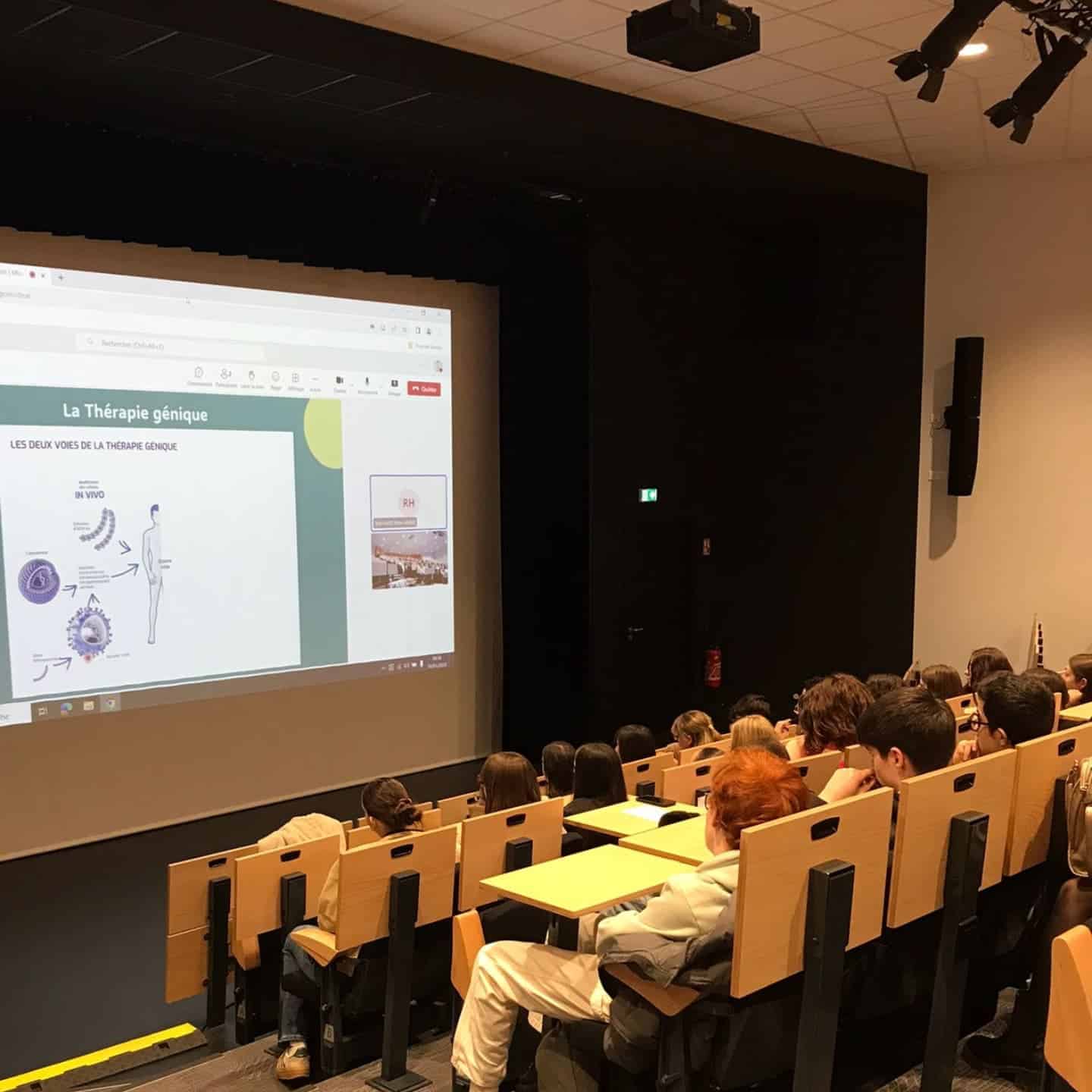 Ce jeudi 16 janvier, les élèves de terminale spécialité SVT et ST2S, suivis des élèves de première spécialité SVT ont pu assister chacun à une conférence en visio d’une doctorante du Genethon, Rim Harb. L’objectif était de sensibiliser les jeunes au monde de la recherche médicale, aux maladies génétiques rares (comme la Dystrophie musculaire de Steinert, une maladie génétique qui affaiblit les muscles) et aux médicaments innovants comme les thérapies géniques et cellulaires. Elle a terminé sa présentation en parlant des métiers de la recherche et de leur diversité. Les élèves étaient attentifs et ont su apprécier ce moment et poser des questions plus personnelles.